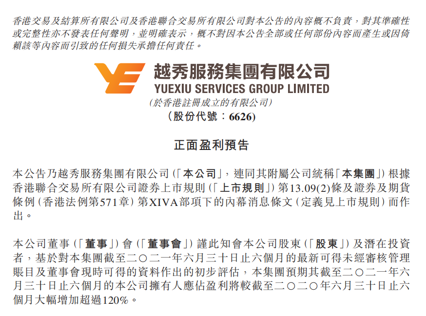 7月15日,ag亚娱服务集团有限公司(6626.HK)发布盈利预喜公告。公告称经过初步评估,集团预期截至2021年6月30日为止的六个月,公司拥有人应占盈利将同比大幅增加超过120%。